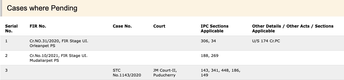 Cr.NO.31/2020, FIR Stage UI. Orleanpet PS. இது போன முறை Affidavitல் சொல்லப்பட்ட தகவல் என்று சொல்லப்படுகிறது, ipcஇன் பிரிவு 306 என்பது, ஒருவரை தற்கொலை செய்ய தூண்டுவது அல்லது உதவுவது குறித்த குற்றமாகும். யாராவது ஒருவர் மற்றொருவரை மன அழுத்தம், மிரட்டல், தொல்லை, அல்லது தூண்டுதல் மூலம் தற்கொலை செய்ய வழிவகுத்தால், இது இந்த பிரிவின் கீழ் குற்றமாகும். இந்த குற்றத்திற்கு சிறை தண்டனை (அதிகபட்சம் 10 ஆண்டுகள் வரை) மற்றும் அபராதம் விதிக்கப்படலாம்.